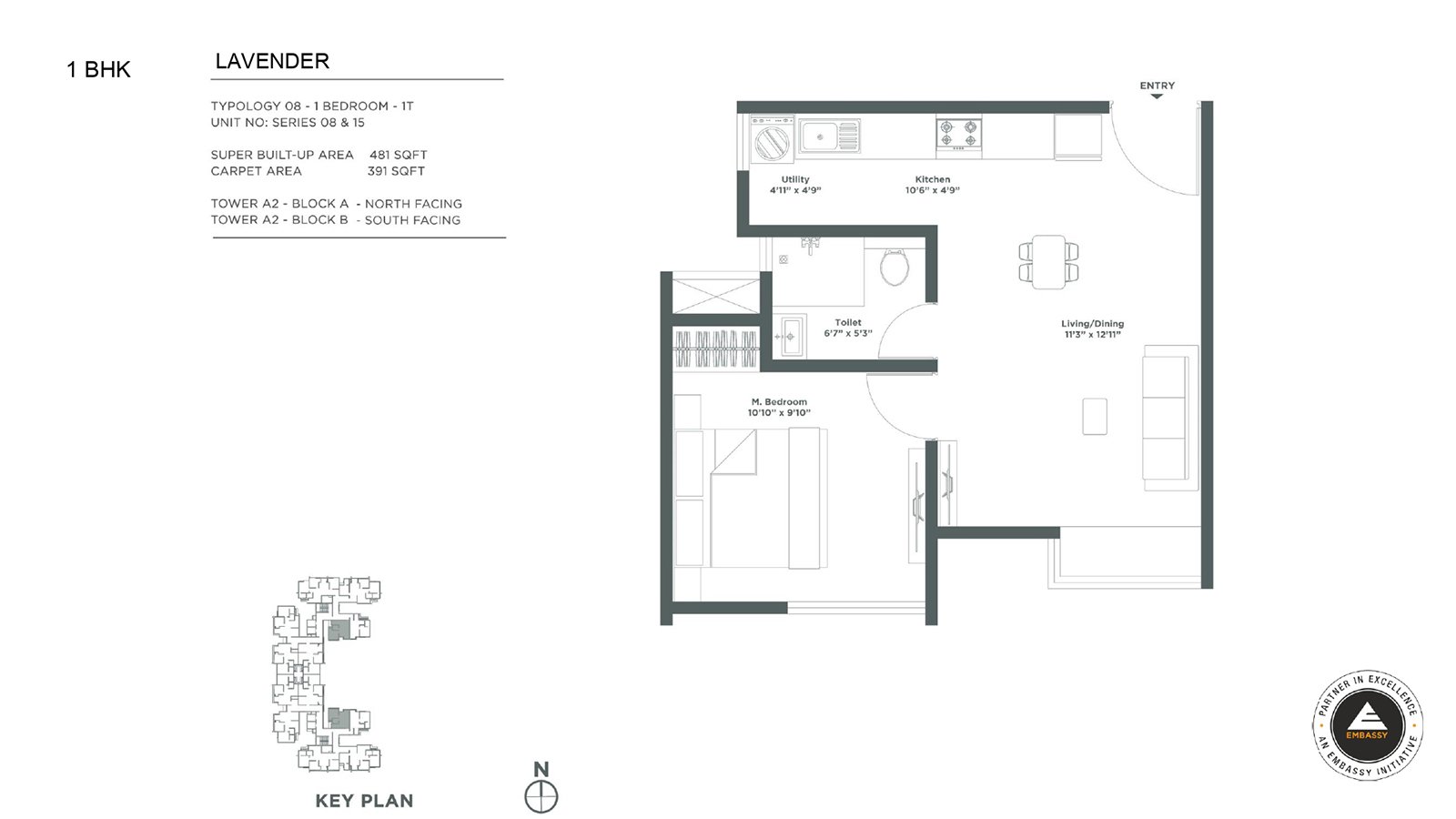 The project houses 1,044 units across three beautiful towers – Lavender, Marigold, and another Lavender block. Embassy Verde Bangalore offers luxury apartments in 1, 2, 2.5, and 3 BHK formats, with sizes starting from 628 sq. ft. to 1,389 sq. ft.